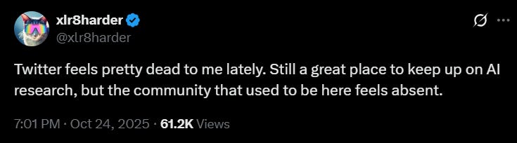 Twitter feels pretty dead to me lately. Still a great place to keep up on AI research, but the community that used to be here feels absent.